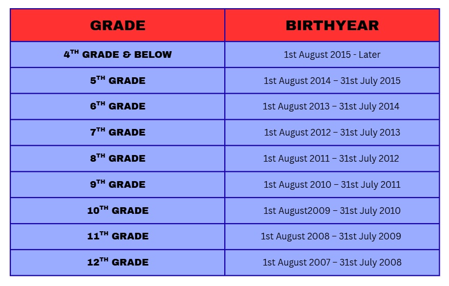 - Middle School 7th-8th grades: Players born 2011 through 2013 (Players with birthdates BEFORE August 2011 MUST play in the High School JV division or higher).